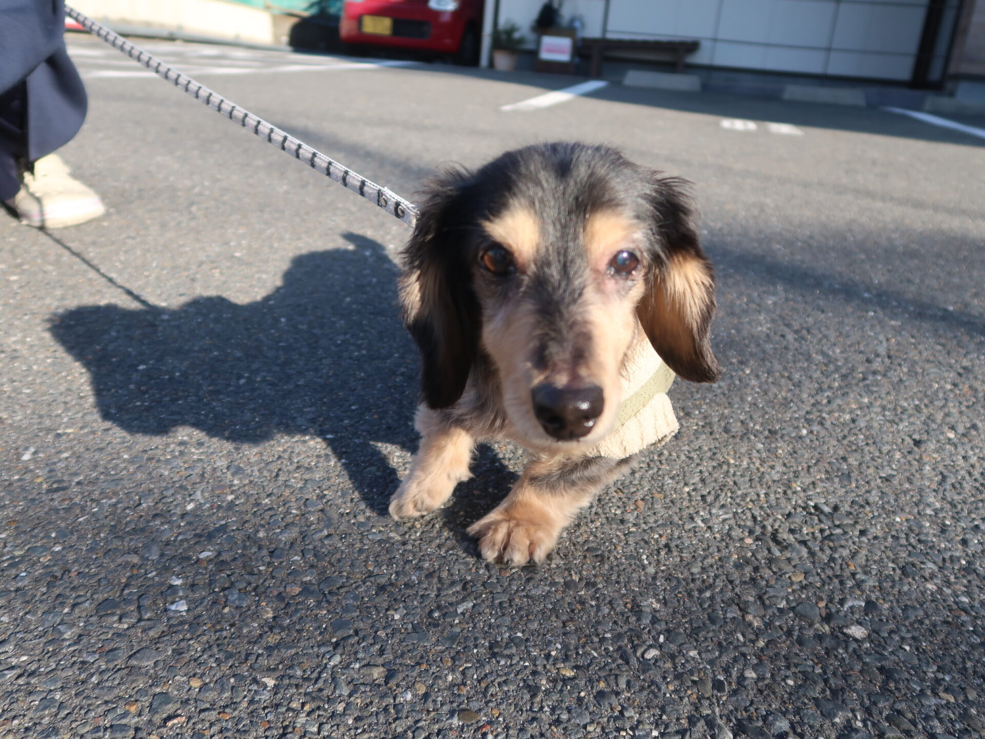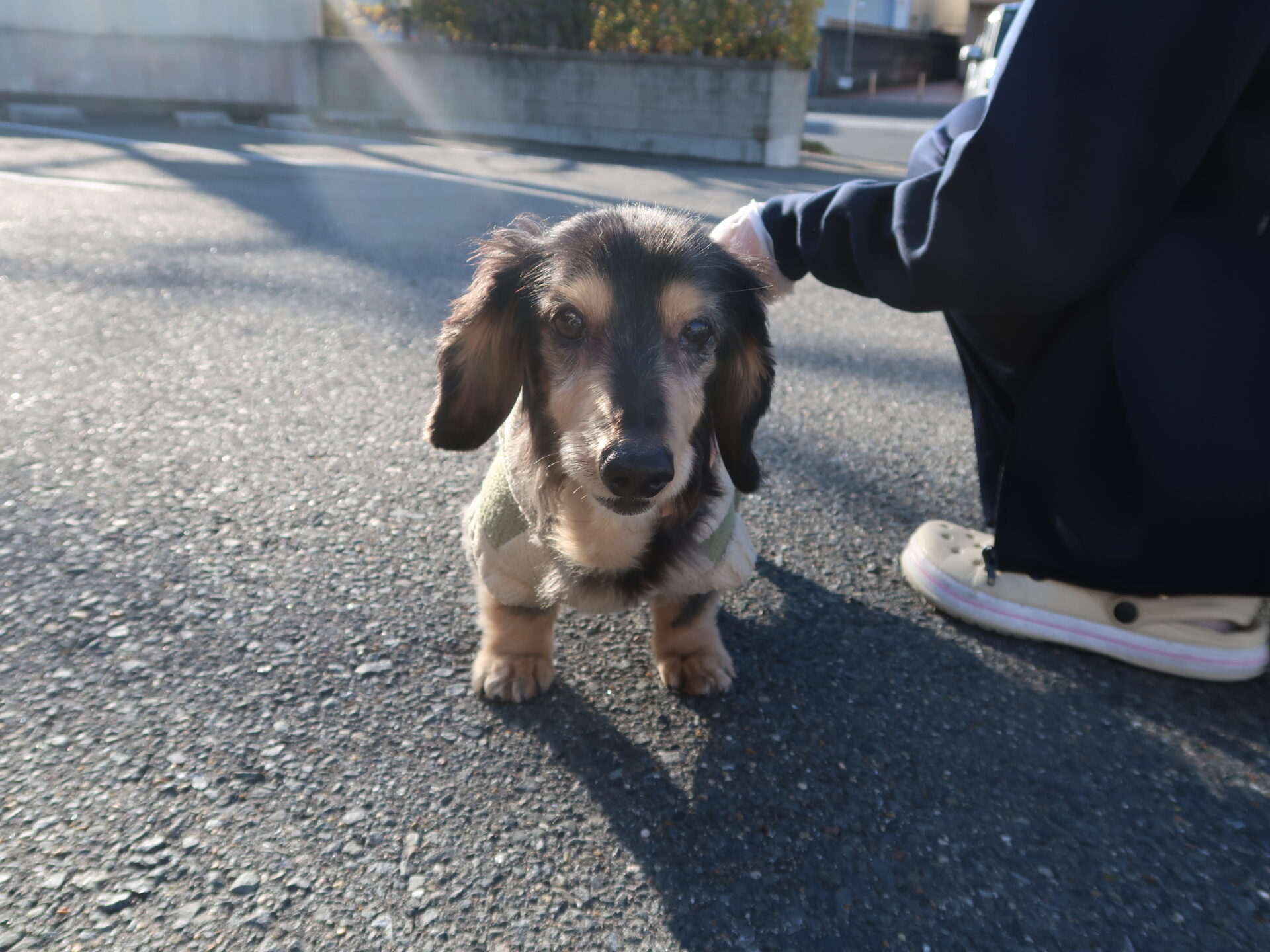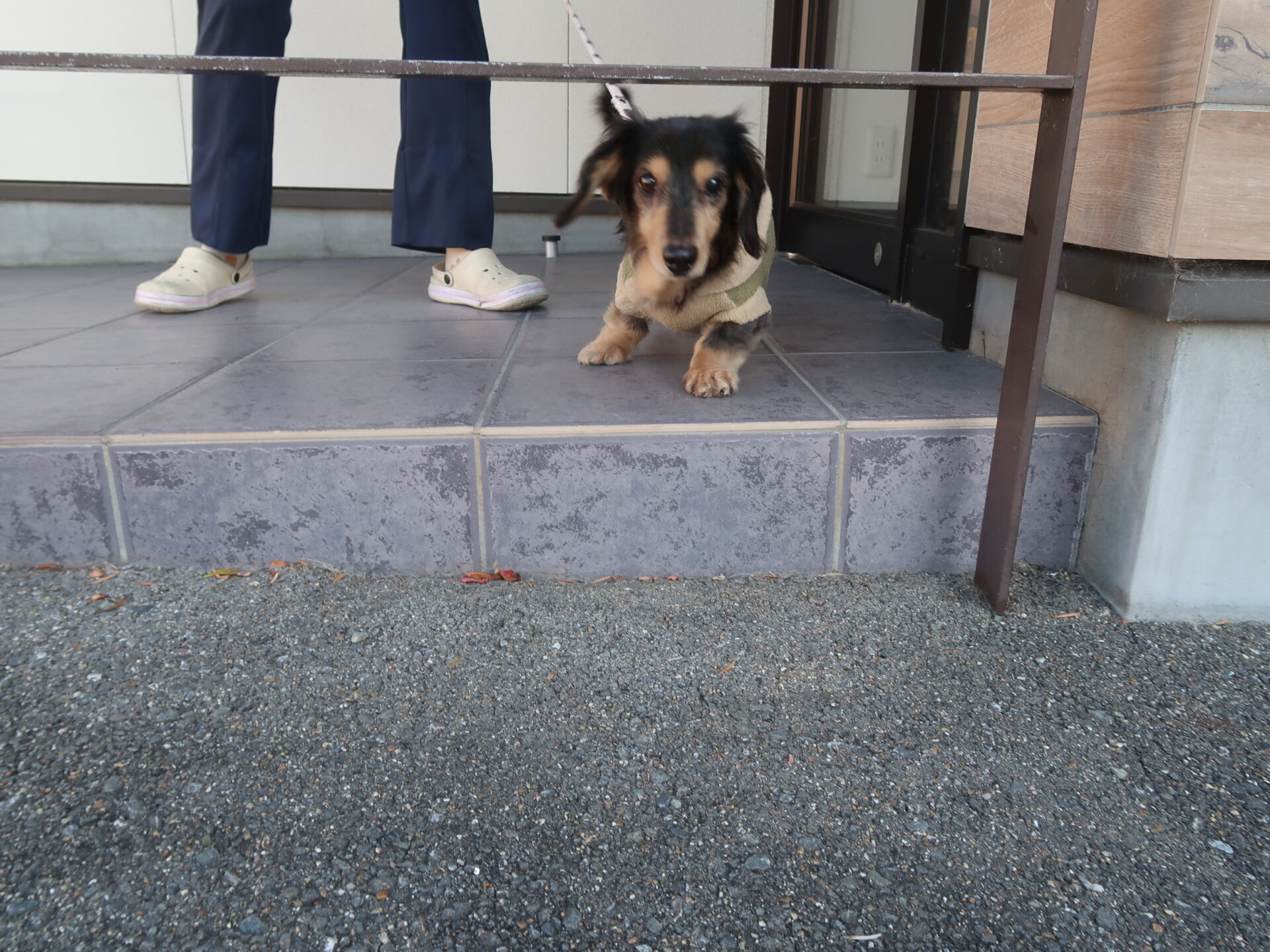 振り向いてみると玄関口からダックスのシナモンちゃんがいまにもダッシュしそうな勢いで